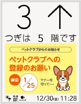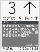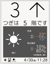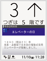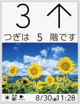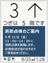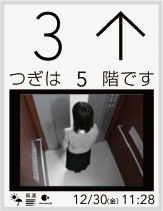 例えばこんなときに・・・ いろいろな情報を液晶インジケーターでお知らせします お客さま作成メッセージ お客さま作成画像 ※1 ※2 弊社からのお知らせ 季節の風景 今日の天気※3 今日は何の日 今日のニュース※3 防犯カメラ映像※4 表示時間を 自由に設定できます。 (5〜30秒) 表示時間を 自由に設定できます。 (5〜30秒) ※当社とメンテナンス契約が必要となります。 ※1 有償付加仕様となります。 ※2 遠隔監視回線がIP回線であることが必要です。 ※3 対象機種は2014年以降に発売された日立標準型エレベーター「アーバンエース」「アーバンエース HF」「アーバンエース HF Plus」です(一部の仕様を除きます)。 [適用外機種] ・2012年12月発売モデル「機械室あり標準型エレベーター制御リニューアルG_Select(ジーセレクト)/巻上機活用タイプ制御リニューアル」以前の機種。 ・上記以外の機種に関しては個別にお問い合わせください。 ※4 メンテナンスサービス提供用カメラ、または日立製カメラが必要です。