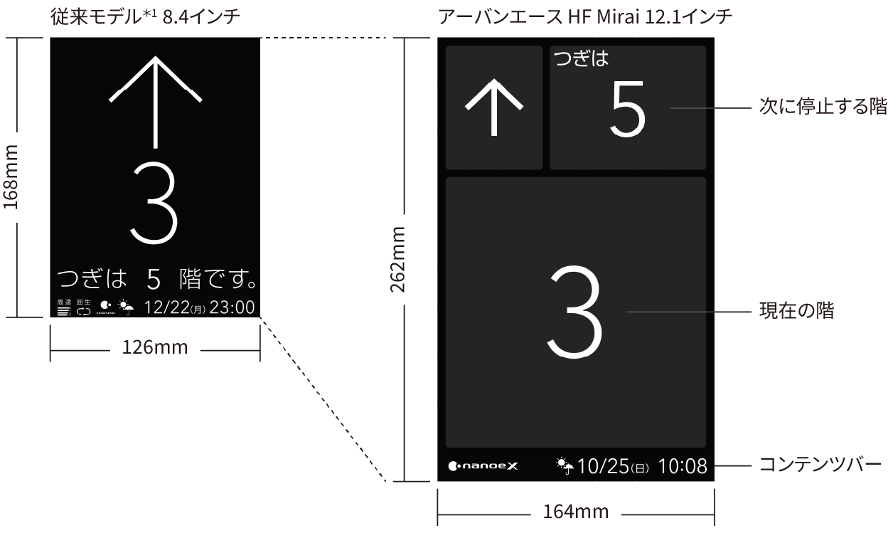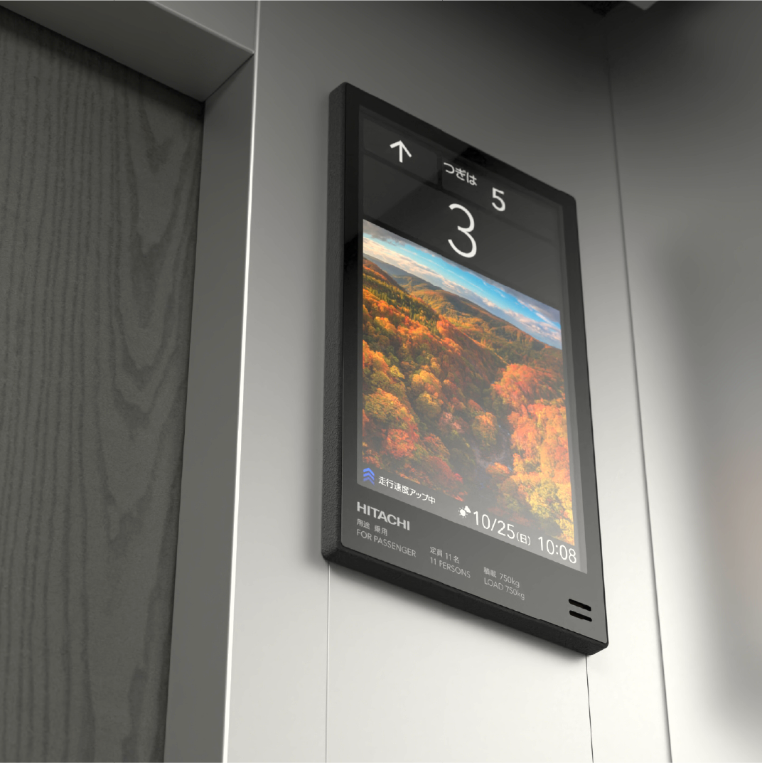 かご内のかご位置表示器は、12.1インチカラー液晶インジケーターを装備しました。従来モデル*1より大きく、少し厚みを持たせた画面は周囲から独立して見え、視線が自然と向くことで視認性が向上します。これにより、利用者に対して情報をより見やすく、分かりやすく表示できます。その他にも、緊急時の4カ国語表示や機能アイコン*2、ニュース*2や天気予報*2など多様なコンテンツが、快適で安心な移動を提供します。
