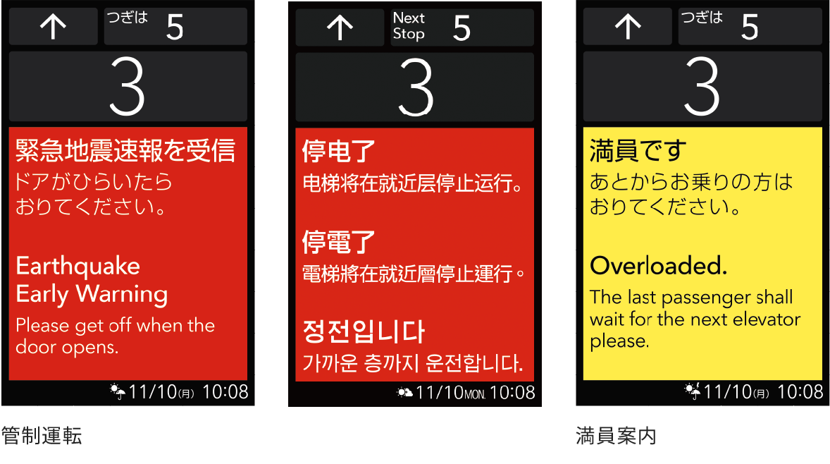 緊急時や注意喚起には日本語・英語/中国語・韓国語を交互に表示します。