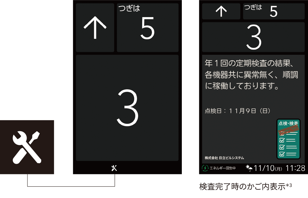 法定検査終了後は、かご内インジケーターに検査完了表示*3をすることで、利用者に安心感を提供します。