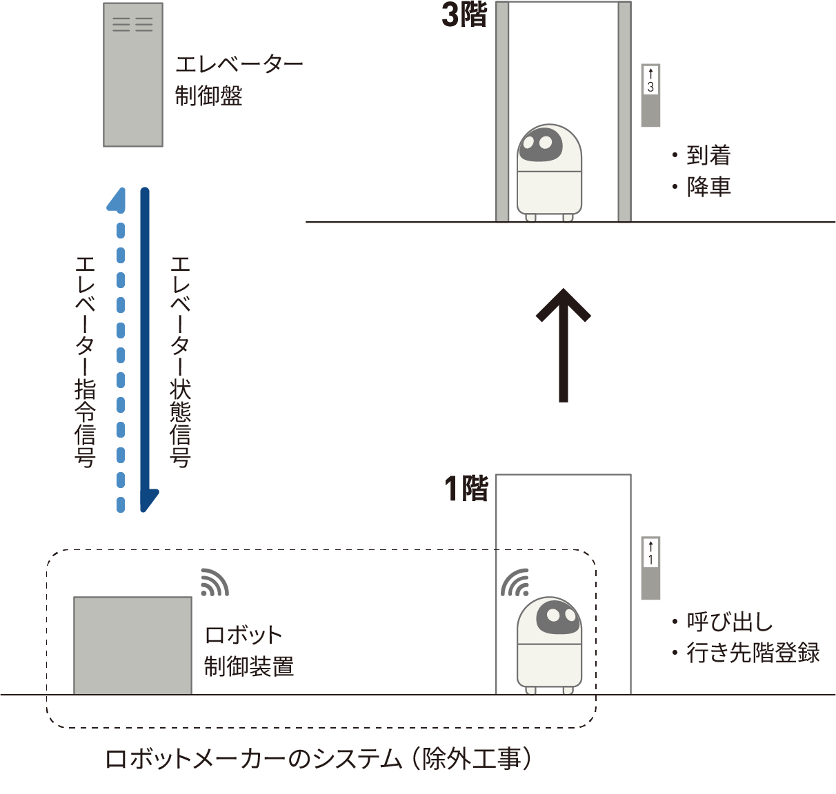 各ロボットの制御装置とエレベーターを専用信号で制御することで、ロボットが利用している間はロボット専用エレベーターとして、乗り込みや各フロアへの移動が可能となります。