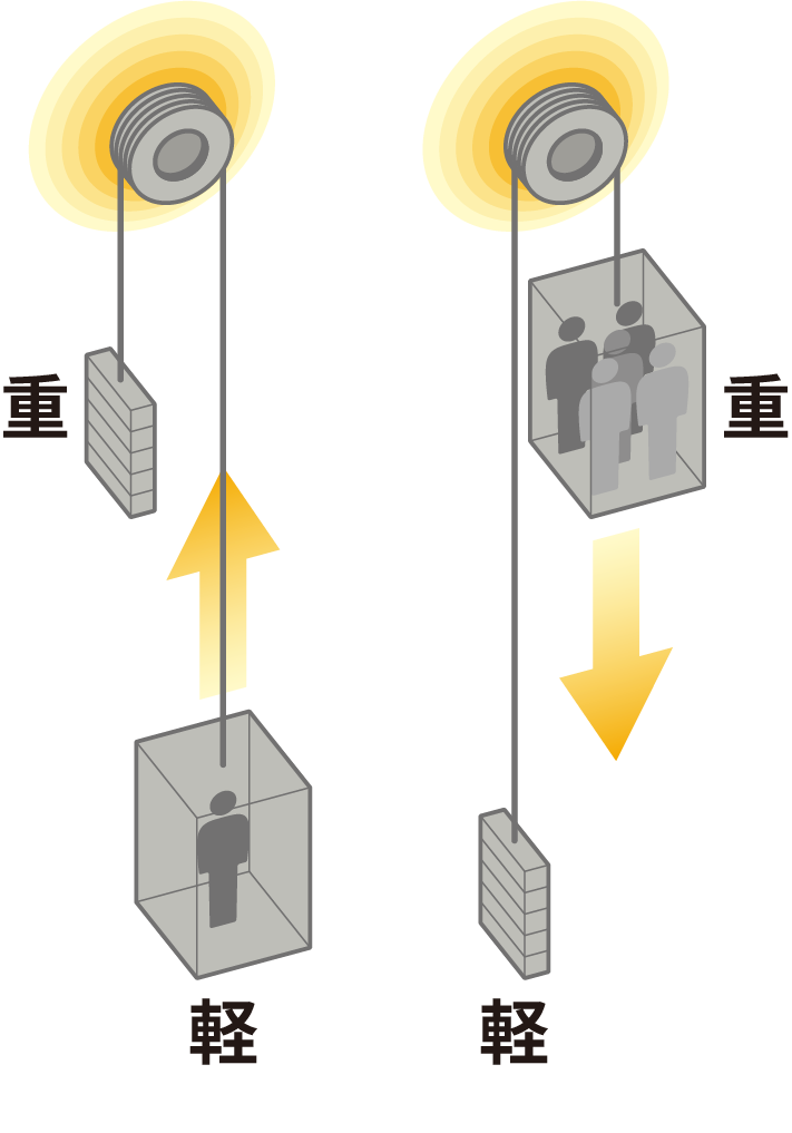積載率を検知し、かごとつり合いおもりの重量差が小さいときに、巻上機の能力を有効活用して、走行速度をアップします。駆動機器や昇降路スペースはそのままで、通常の定格速度運転に比べて利用時間と待ち時間が短縮します。