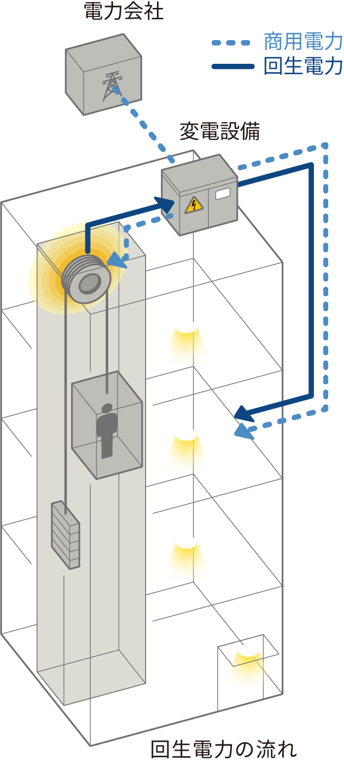 エレベーターの運転状況により発生する回生電力を建物内で利用します。