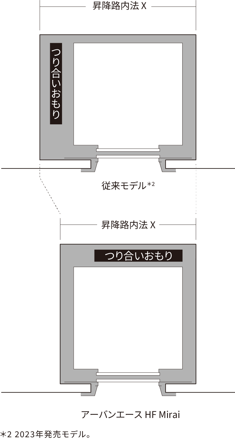 P型(乗用)において、つり合いおもりをエレベーター背面側に配置。間口方向の昇降路内法寸法を縮小することで、効率的な建屋レイアウトを可能とします。