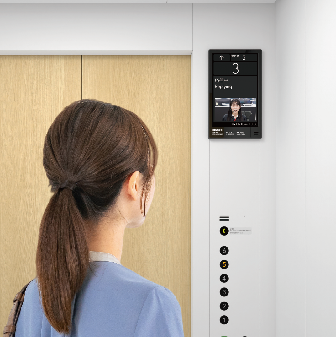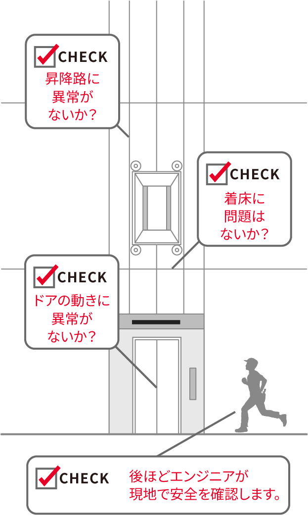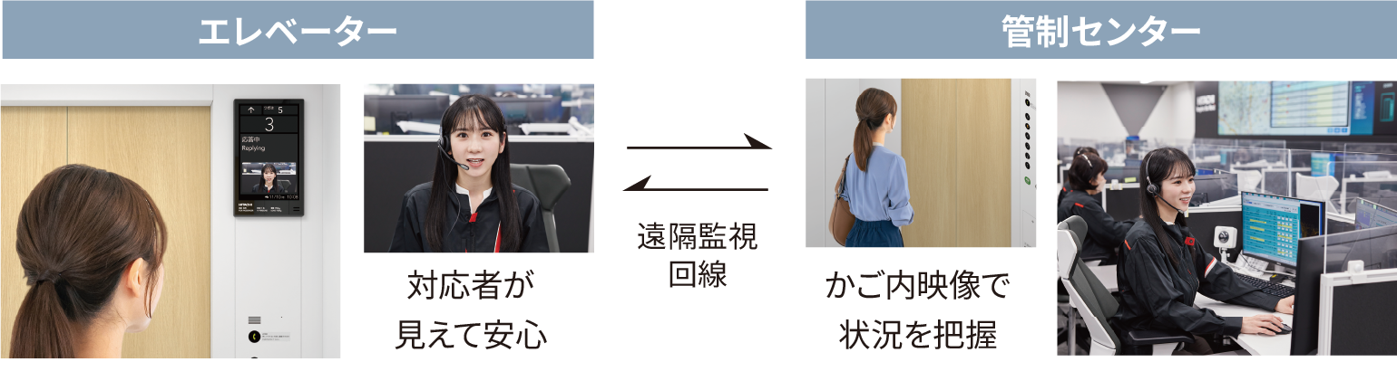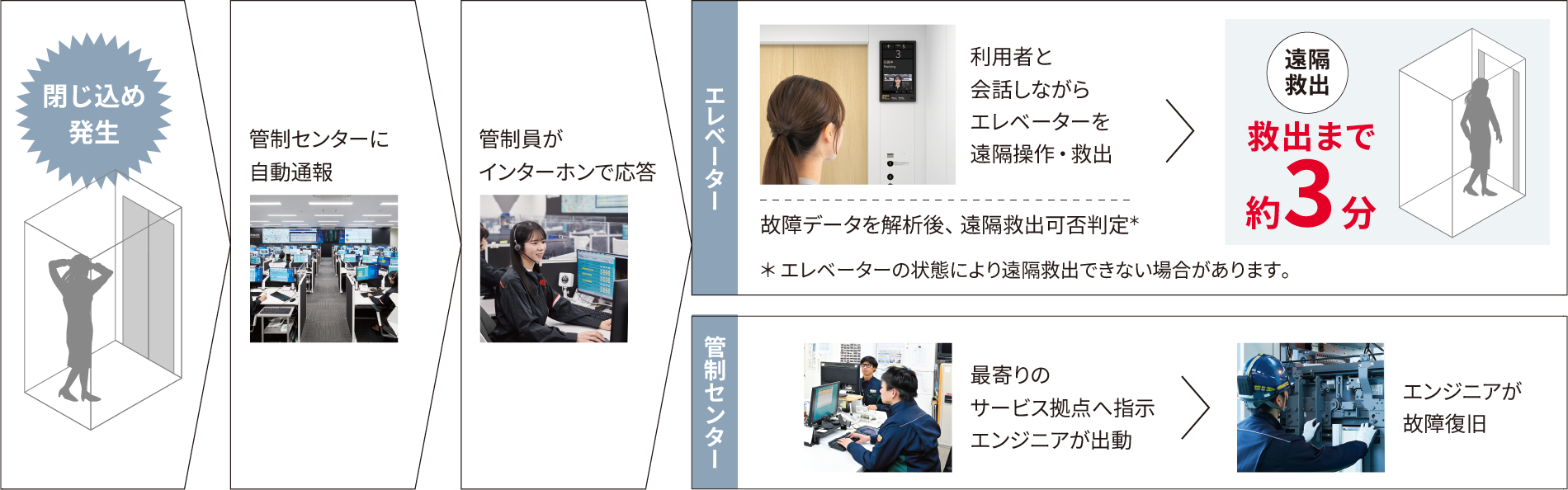 万一の故障により利用者がかご内に閉じ込められた場合、管制センターからかご内の状況を確認。エレベーターを遠隔操作し、素早く救出します。その際、かご内の液晶インジケーターに対応者を表示しながら会話ができることで、利用者の不安を和らげます。また、同時にエンジニアが緊急出動して、機器の確認、故障復旧を行います。