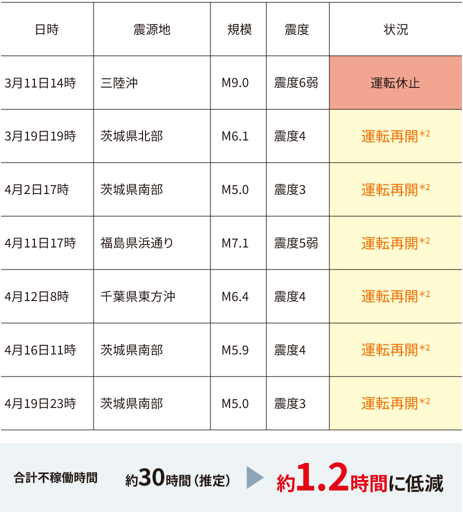 *2 自動仮復旧運転となります。その後、エンジニアによる点検を経て平常運転に復帰します。