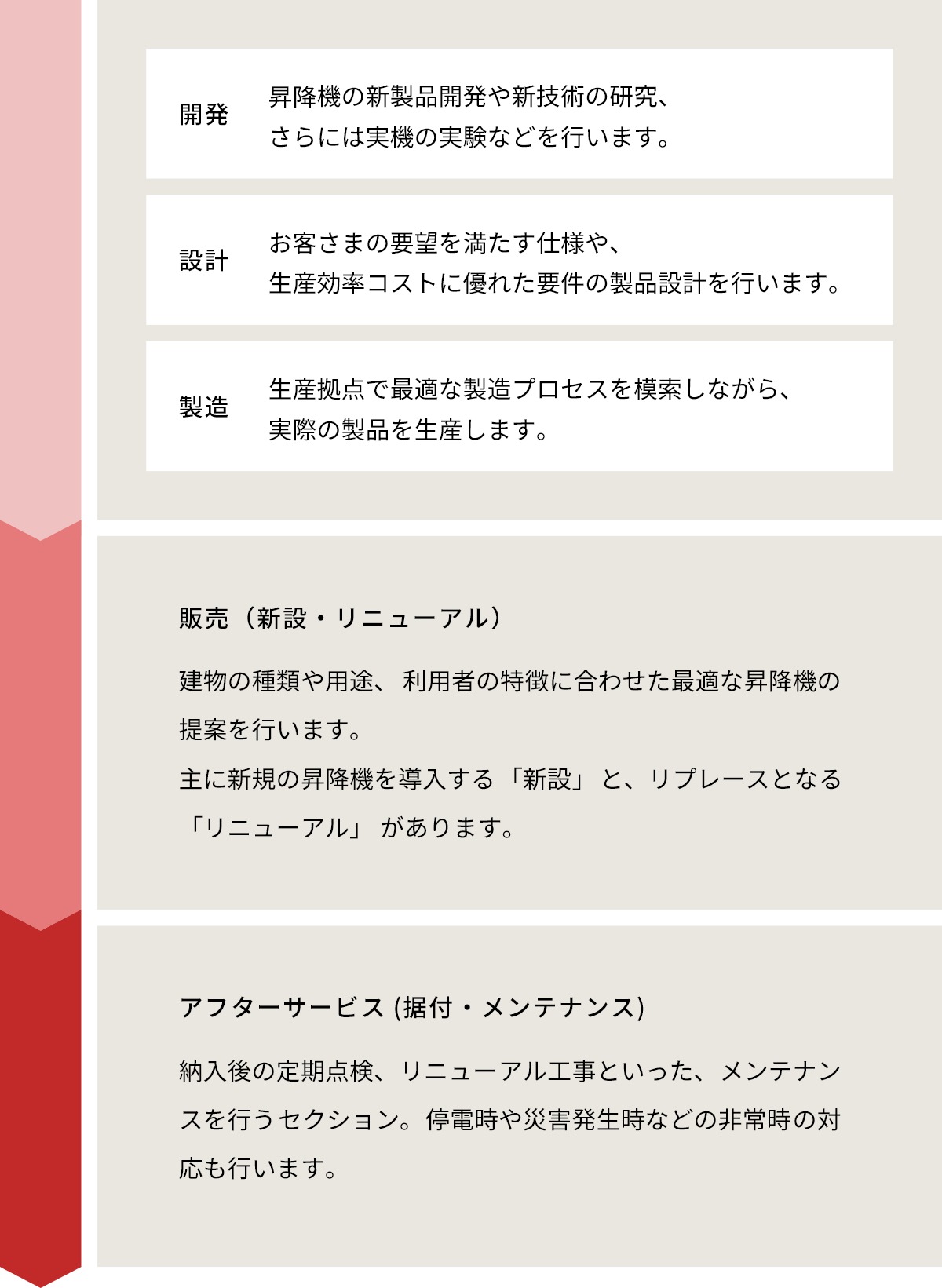 日立ビルシステムの強みとして、昇降機の開発・設計・製造・販売・アフターサービス