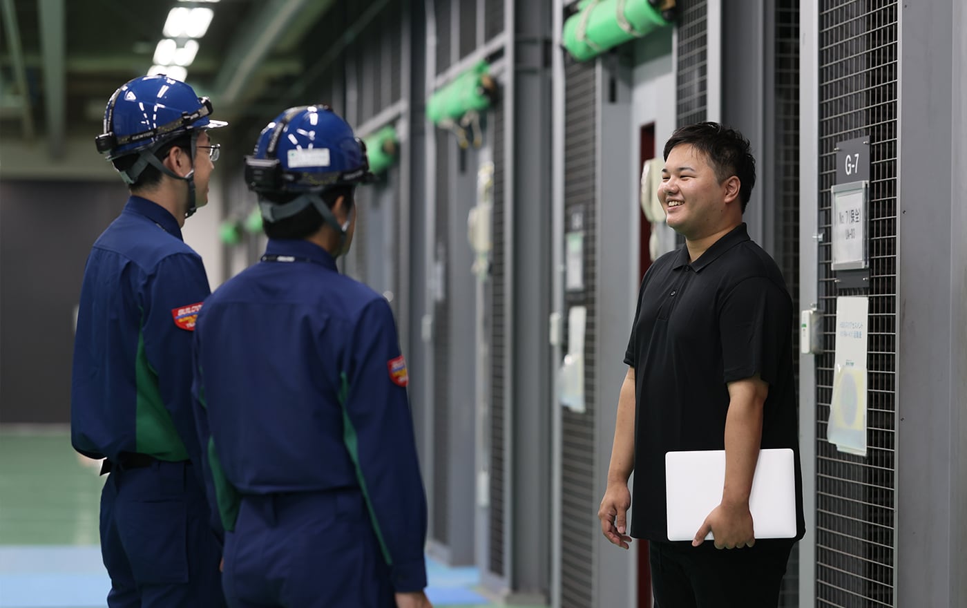 グローバル研修センターを含む亀有総合センター内には、実習用エレベーター51台、エスカレーター11台のほか、ビルソリューション製品・サービスも備え、実機をもとに実践的な技能教育を行っています。また、海外規格の昇降機実機を備えており、国内にいながら世界基準の技術を習得することが可能です。新入社員教育は本研修センターで実施しています。