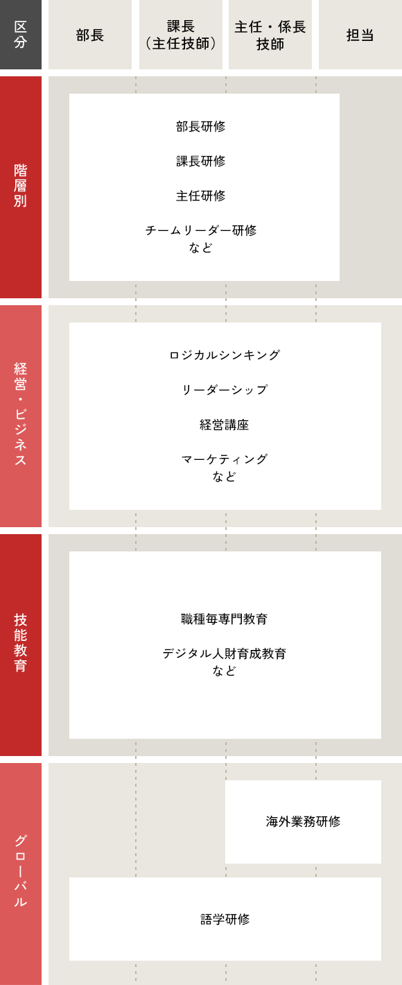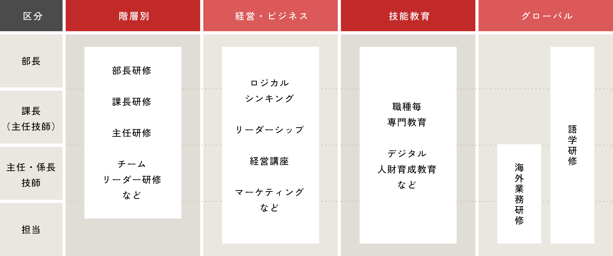 それぞれの職種・階層で求められる高度なスキルや知識を習得するために、階層別、経営・ビジネス、技術教育、選抜型教育など、数多くの教育を準備しています。