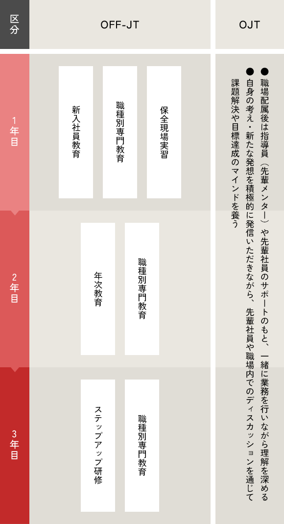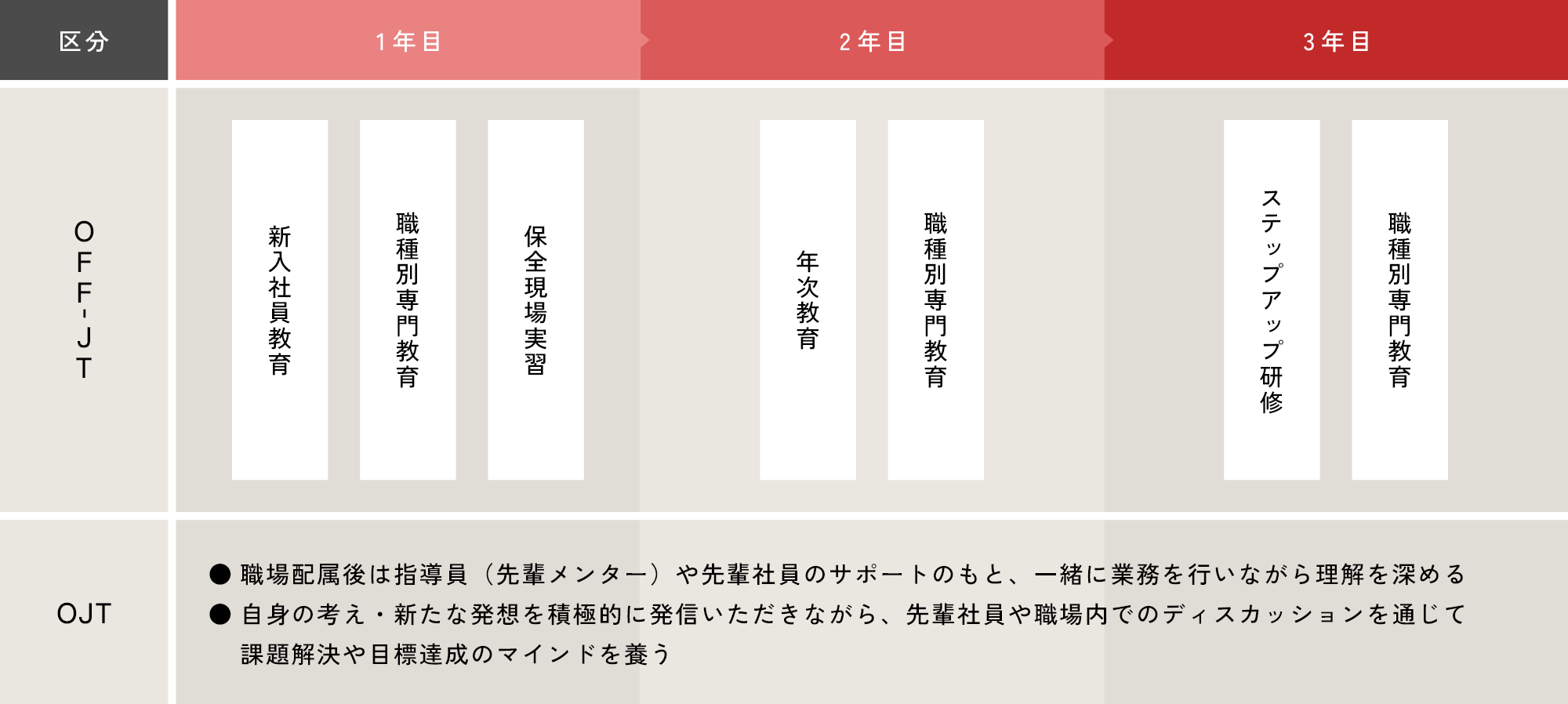 新入社員教育や各専門教育を通じて、知識がない方でも実践的なスキルを習得できる教育体制を整備しています。