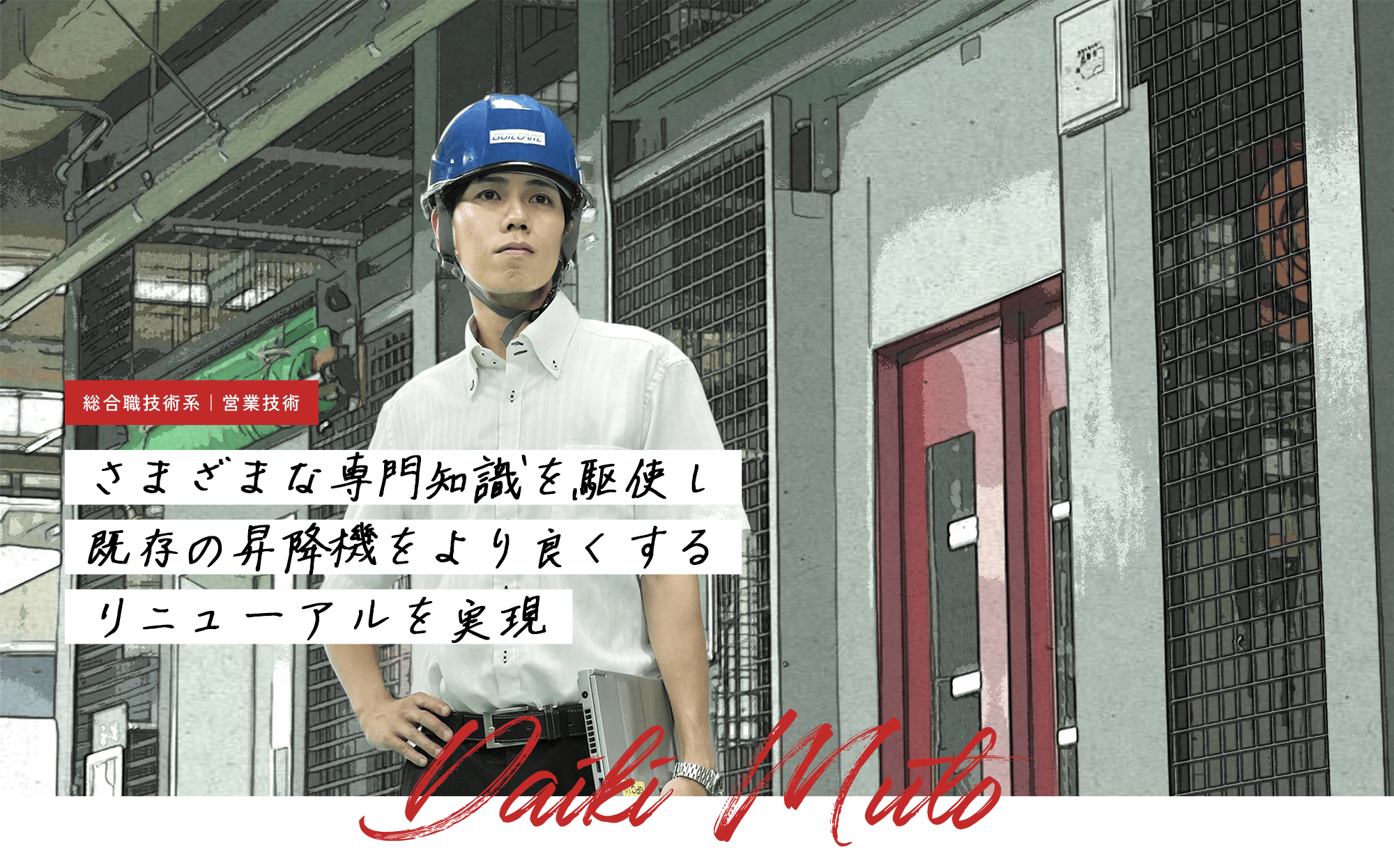 モノづくり関係の仕事を中心に企業研究をしていた際、大学主催の企業説明会で知ったのが当社でした。昇降機は重要な社会インフラであり、直接、人のためになるモノづくりに携わりたいという自分の思いにマッチ。その後の選考過程でも、社員の話を聞いて、やりがいのある仕事だと確信でき、入社を決めました。