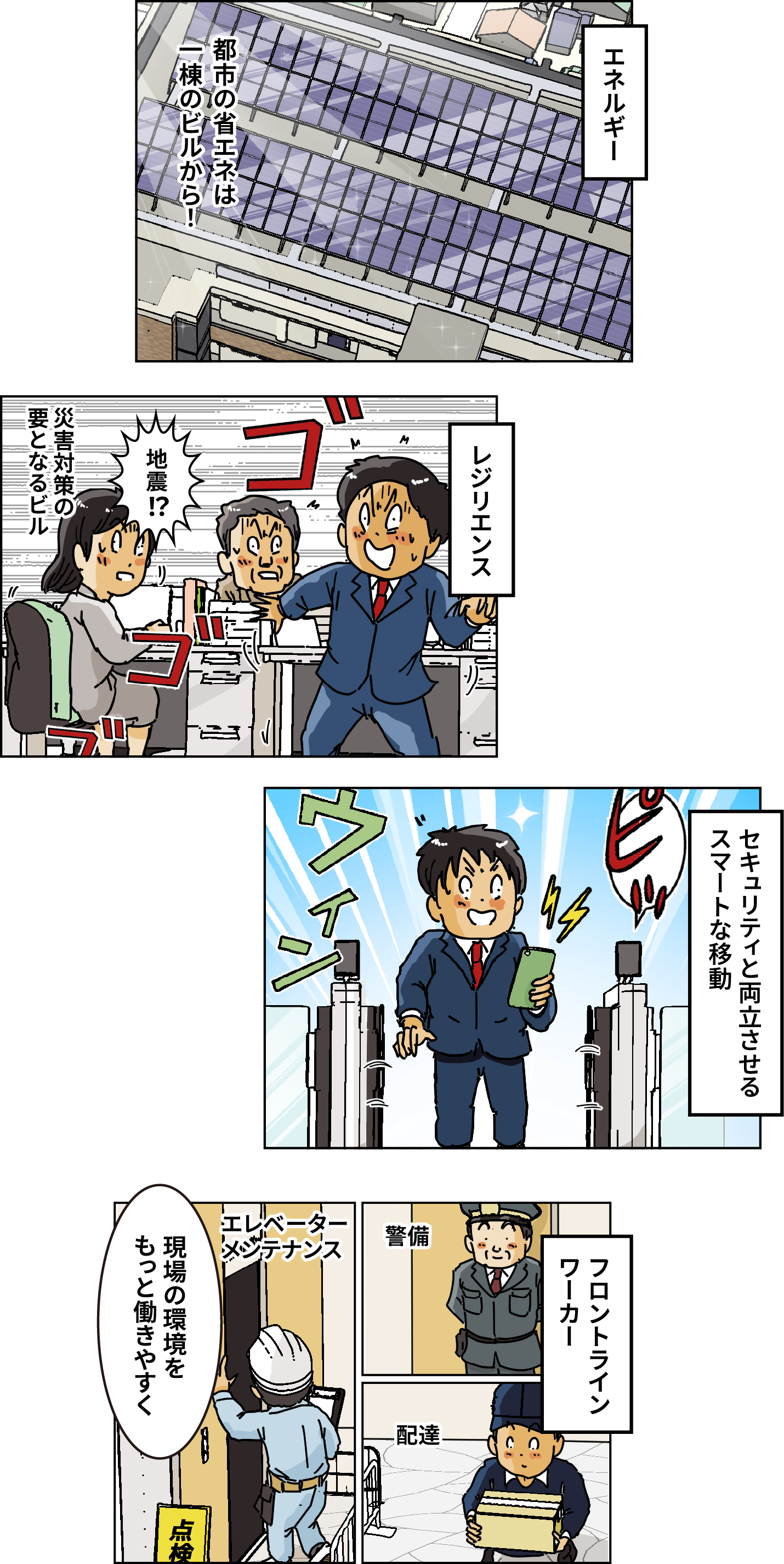 ビルは、デジタルの便利さや確かな技術、そして現場を支える人の力が重なり合うことで、もっと快適に過ごせる場所に進化していきます。AIが異常を知らせ、災害にも的確に備え、現場の人が日々の暮らしを支えてくれる⸺そんな小さな進化の積み重ねが、街の未来を変えていきます。